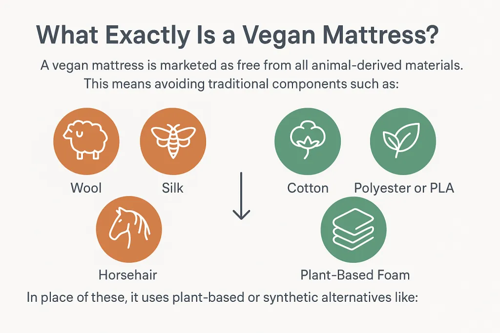 A vegan mattress avoids animal‑derived materials such as wool, silk, horsehair, cashmere, and alpaca. Fabrics and fills are typically plant‑based (e.g., cotton, hemp, bamboo) or synthetic (e.g., polyester, foams). True vegan claims should also consider adhesives, dyes and finishes that might contain animal derivatives.