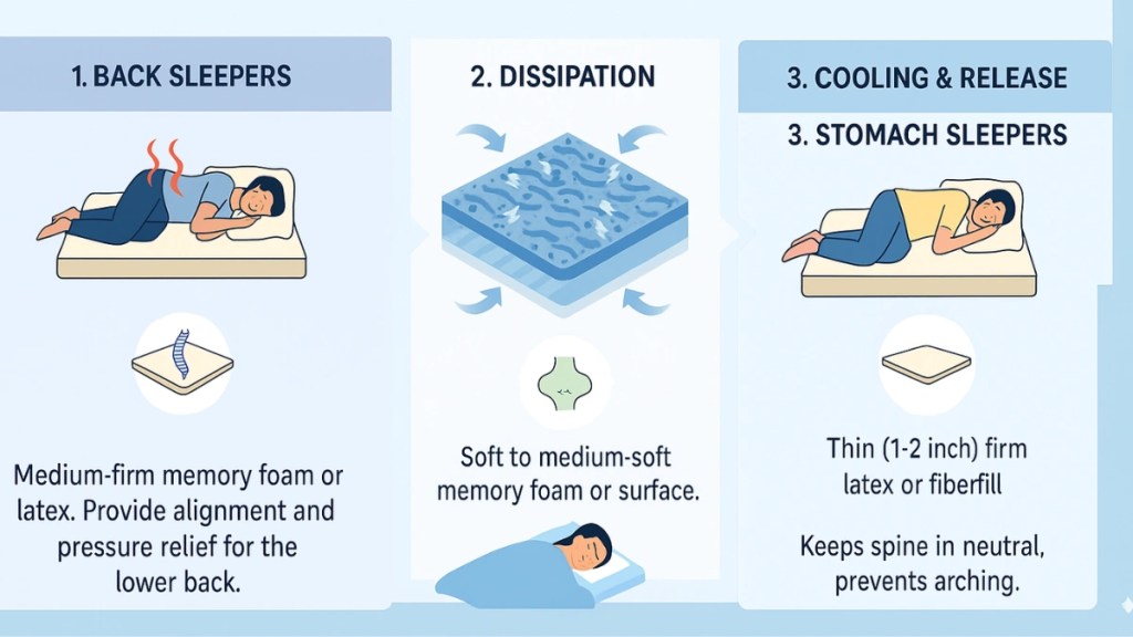 Side sleepers usually prefer medium firmness for pressure relief, while back or stomach sleepers may need firmer options. Couples benefit from even heat distribution and motion isolation.