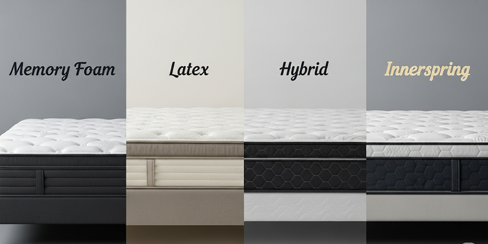 Knowing the different types of mattress will help you narrow down your choice, of custom vs standard mattress. Memory foam, latex, hybrid and innerspring are the four main types, Each caters to specific sleep needs. Let’s explore which works best for your sleep style.