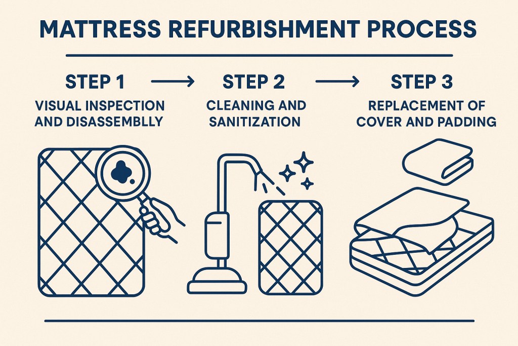 The process of refurbishing a mattress is not universally standardised and can vary widely depending on the company, region, and type of mattress. However, most refurbishment operations follow a general sequence that includes inspection, cleaning, cosmetic improvements, and resale. Here’s a closer look at what typically happens behind the scenes: