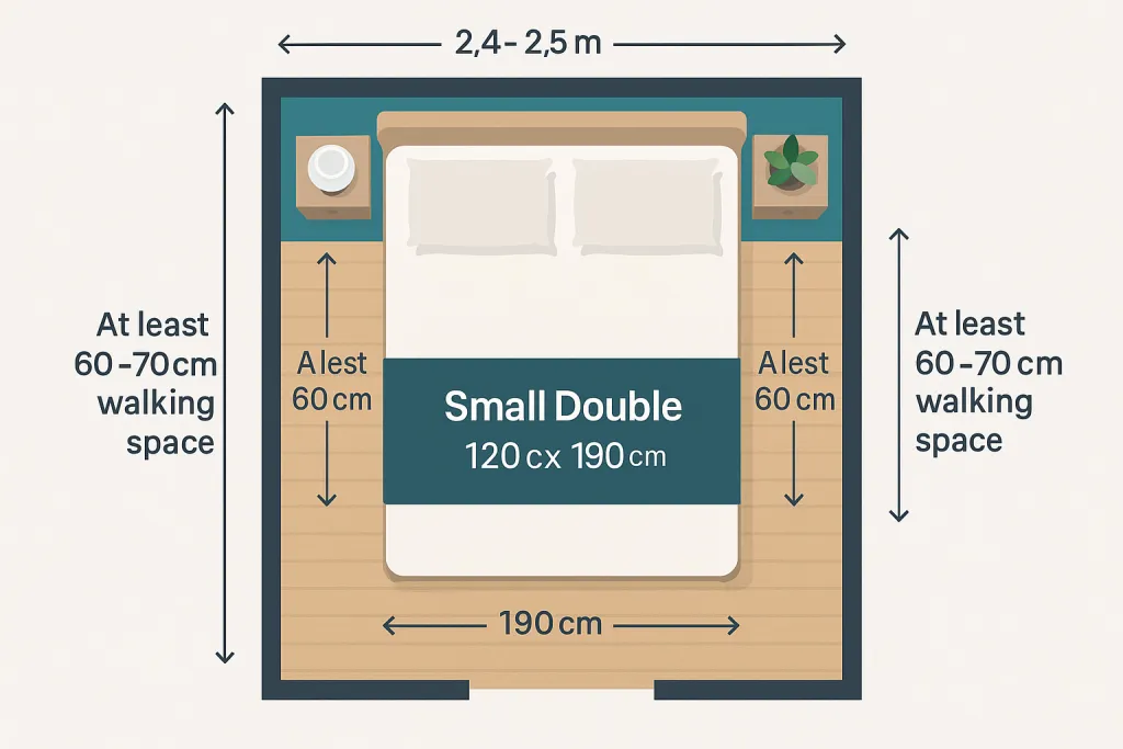 Ideally, you should leave at least 60–70 cm of walking space on each side of the bed. A small double bed frame usually measures about 130 cm wide, so a room at least 2.4–2.5 metres wide is ideal.
