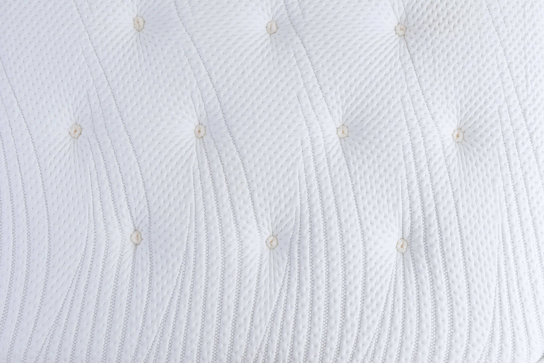 The outer fabric is a white button-tufted premium material designed to last and breathe. It resists bacteria dust mites and allergens while the semi-polyester fused surface supports airflow and keeps body heat from building up.