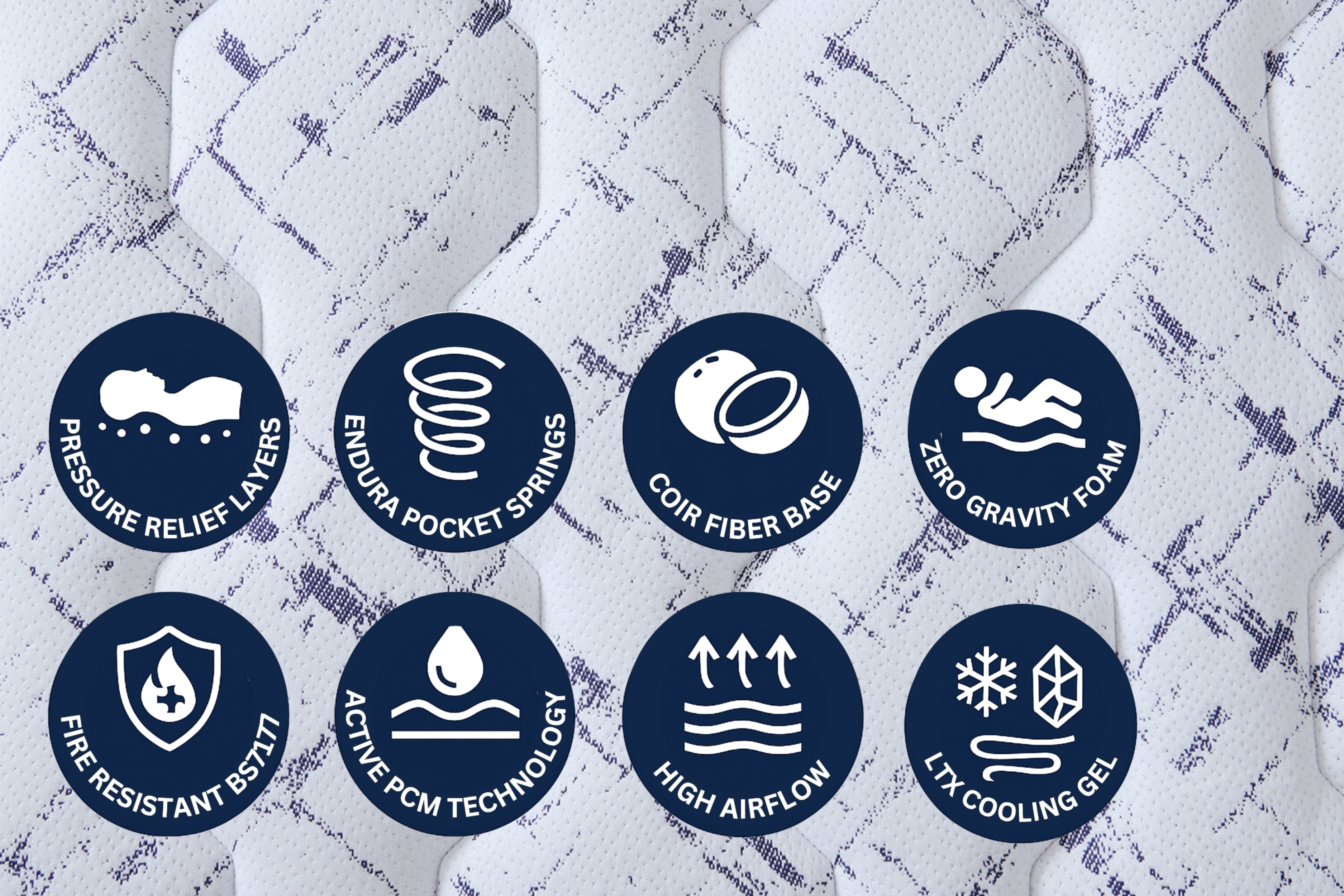 The top layer uses Zero gravity foam infused with Ltx Cooling Tech™, a graphite-based gel that pulls heat away from your body. Unlike dense memory foam, this layer responds quickly to movement and allows air to pass through it. The result is a cooler, fresher feel that still contours to your shape.