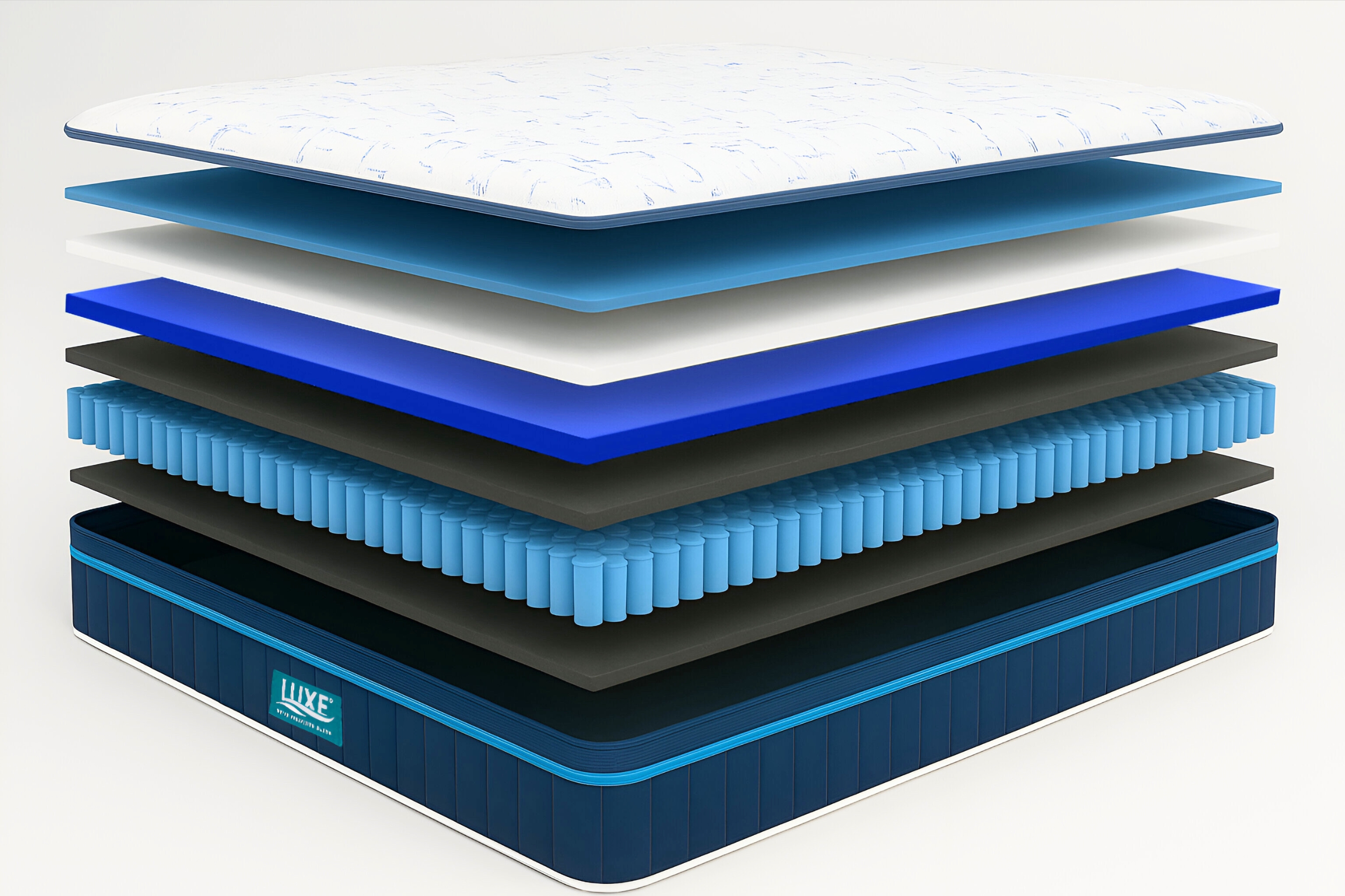 The Luxe Therm Hybrid Cooling Mattress was designed to solve this exact problem. It combines modern cooling technology with strong spinal support and breathable materials. Here’s how each layer works to keep you comfortable: