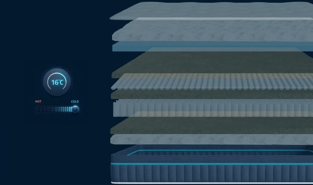 The Luxe Therm Hybrid Cooling Mattress was designed to solve this exact problem. It combines modern cooling technology with strong spinal support and breathable materials. Here’s how each layer works to keep you comfortable:
