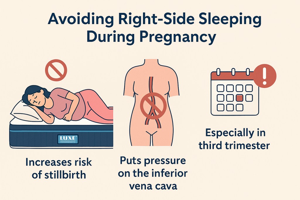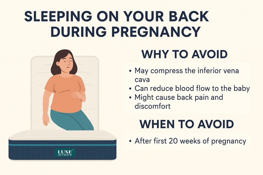 It’s fine in early pregnancy, but after the first trimester, sleeping on your back can compress the major blood vessels in the back. Positioning pillows or using a properly designed mattress can encourage side lying.