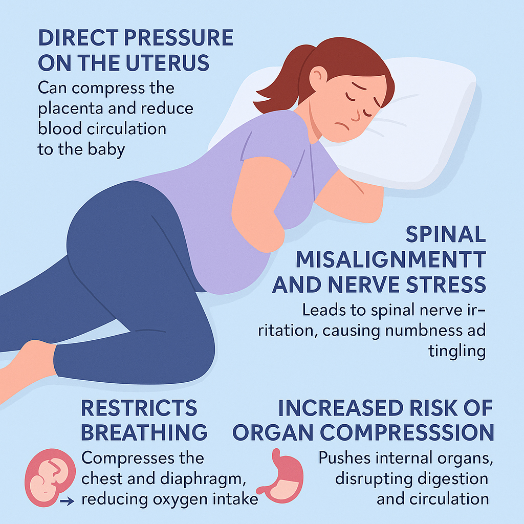 Sleeping on your stomach becomes uncomfortable, and eventually, it becomes impossible (when the belly becomes large). It stresses the neck and lower back, and can lead to ligament pain.