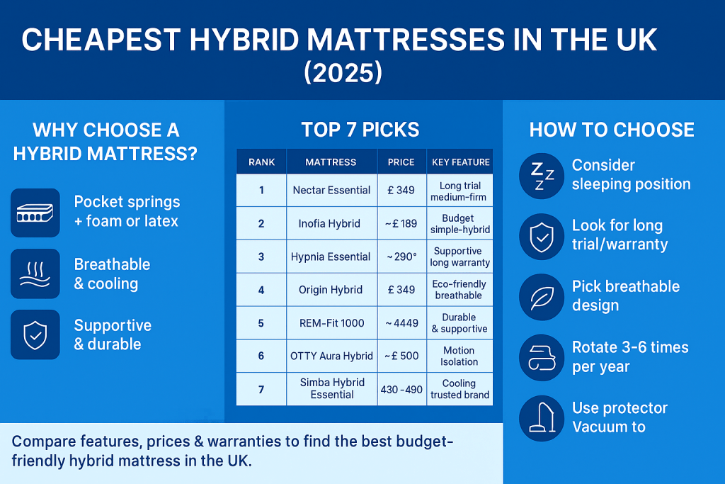 | 7 | Simba Hybrid Essential | £430–£490 | Cooling technology, trusted brand |