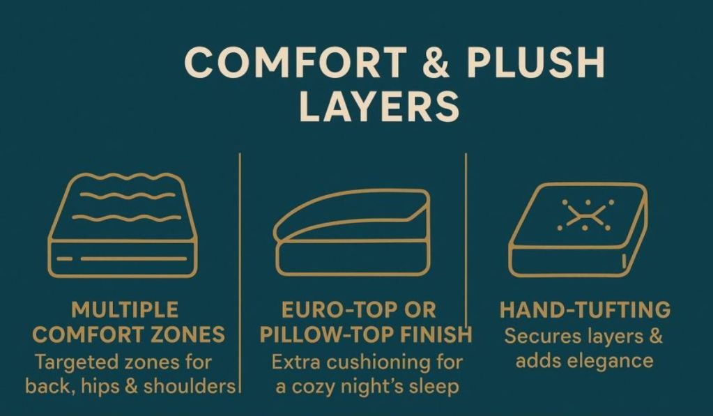 What truly makes a luxury mattress feel like a dream is the comfort and plush layers on top. These are the finishing touches that transform a good bed into a truly exceptional one. Here’s what you’ll find inside: