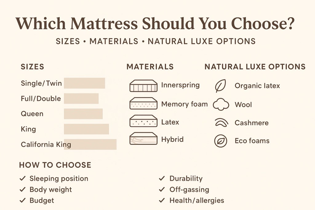 Choosing the right mattress is about balancing size, material, cost, and durability. Smaller beds save space but may compromise comfort, while larger options like king-size mattresses offer room and support at a higher price. Material matters too memory foam, latex, hybrids, and natural luxe layers each provide different levels of comfort and longevity. Cost should be considered in terms of long-term value rather than just upfront price.