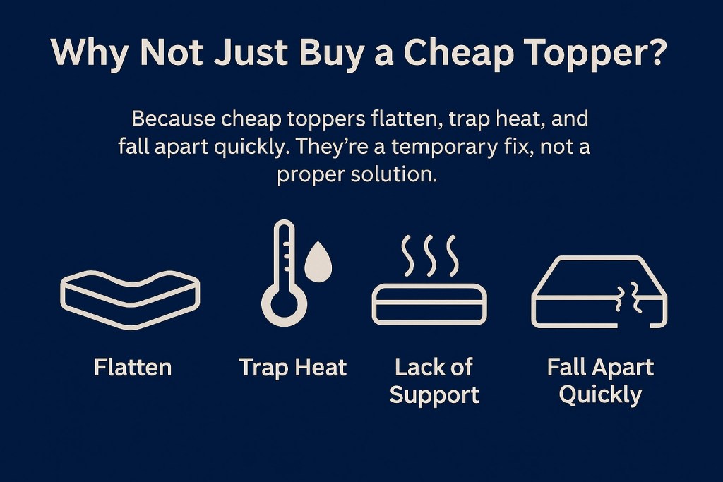 Because cheap toppers flatten, trap heat, and fall apart quickly. They’re a temporary fix, not a proper solution.